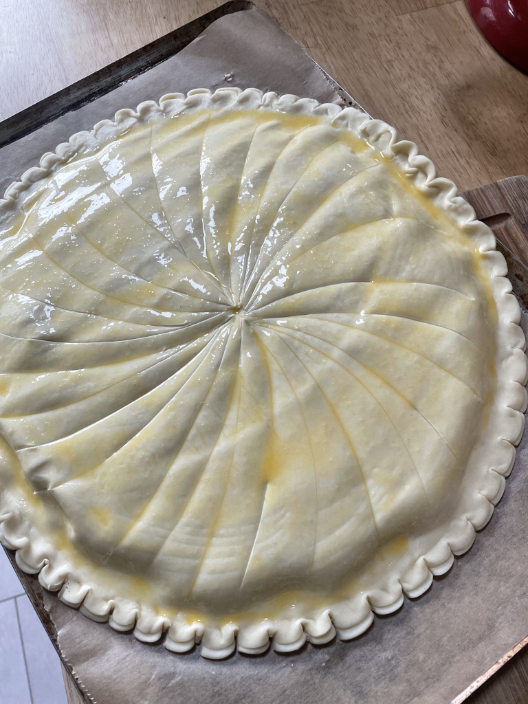 Au bout de ce temps dorez à nouveau la galette à l’oeuf puis décorez-la en traçant des croisillons ( ou autres motifs ) à l’aide d’un couteau en faisant attention de ne pas transpercer la pâte.