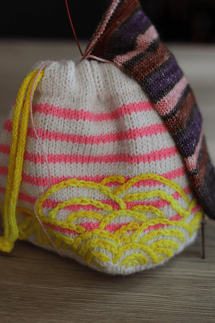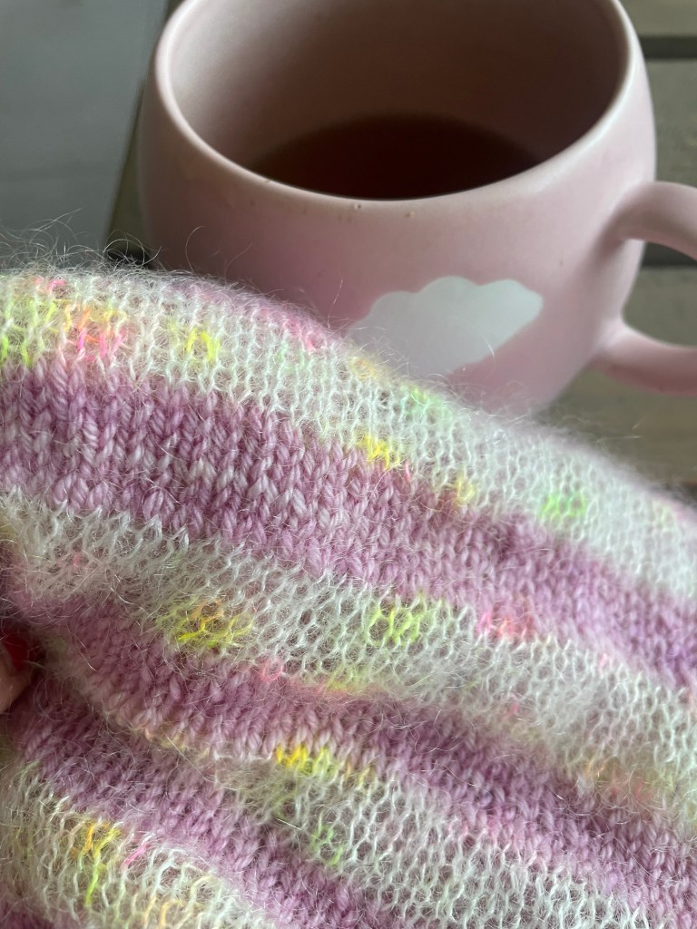Le gilet Elton de Joji Locatelli que je tricote en Mohair au fil d’Horus et Mérino coloris » flirt » de the Woolly Skein.